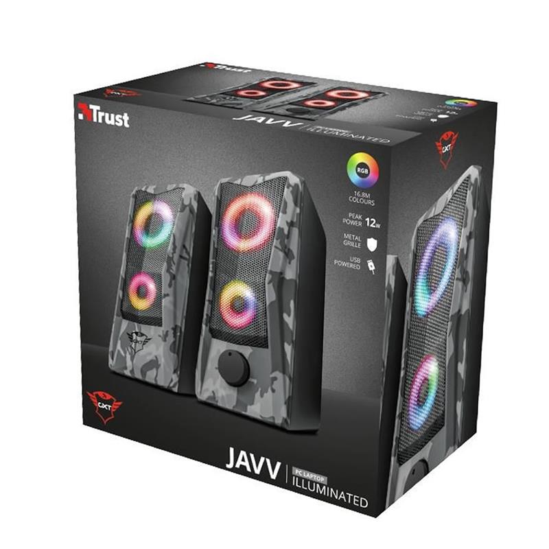 Con un diseño compacto, el juego de altavoces GXT 606 Javv 2.0 con iluminación RGB hace gala de un atrevido estampado de camuflaje y coloridas luces RGB que te pondrán de ánimo para ganar. Disfruta del audio de tu equipo en estéreo sin tener que usar auriculares. Es muy fácil: basta con conectar el cable USB y auxiliar al portátil y listo.